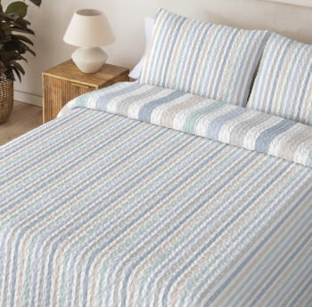 Venta de colchas boutie reversible con rayas azules, beige y verde agua.